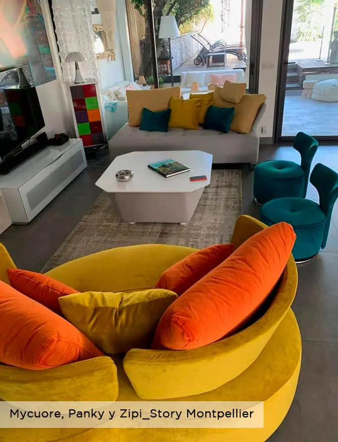 Geometría variable. Panky sigue un diseño de respaldos con formas contorneadas soportados sobre una base recta de amplias dimensiones y con un diseño de capitoné. Los respaldos parecen flotar en el aire dando al diseño ligereza visual y frescura.